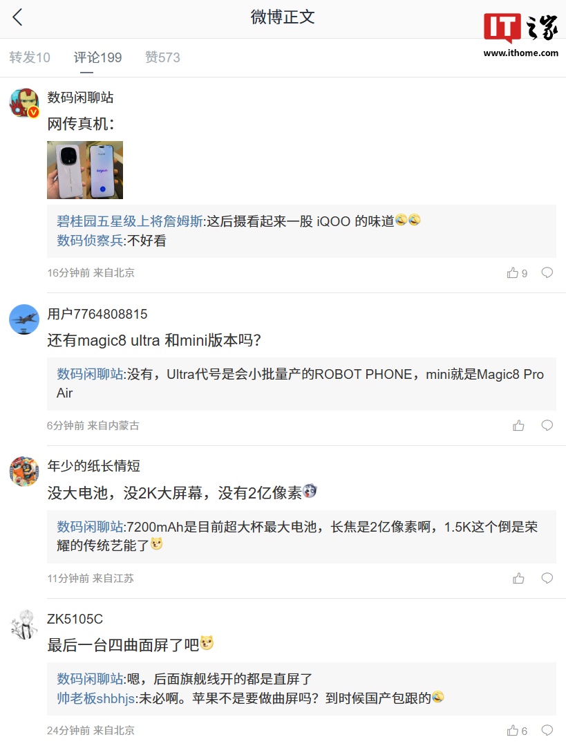 性能:骁龙 8 Elite Gen5 处理器规格:顶配 24GB+1TB屏幕:6.71 英寸 2808*1256p 1.5K LTPO 等深四曲屏影像:前置 50Mp 镜头 | 后置 50Mp 超大底主摄 F1.6 光圈 +50Mp 超广角 +200Mp 大底潜望长焦 F2.6 光圈 85mm 3.7X 光学变焦镜头组合 | 主摄和长焦支持 OIS 防抖电池:7200mAh 电池 | 120W 有线闪充 + 80W 无线闪充安全:3D 人脸识别 +3D 超声波指纹防护:IP68/IP69/IP69K设计:侧边拍照键通信:支持天通卫星通信博主还在评论区回复了部分网友的问题,其中提到了 Magic8 Ultra 的信息:“Ultra 代号是会小批量产的 ROBOT PHONE倍顺网,mini 就是 Magic8 Pro Air。”