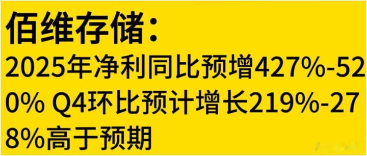 佰维存储2025年净利同比预增427%-520%,Q4环比预计增长219%-278%,且高于预期。这样的业绩增长非常亮眼,说明公司的经营状况良好,在存储领域可能处于快速发展阶段。
