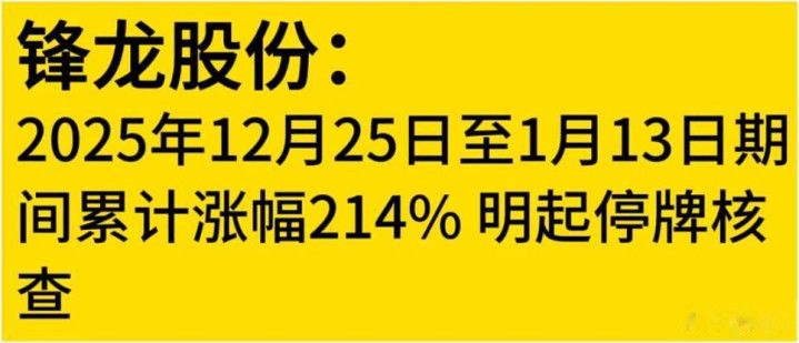 锋龙股份在2025年12月25日至1月13日期间累计涨幅达214%,明起停牌核查。股价的大幅波动触发了停牌机制,这也是市场对异常波动的一种监管手段,投资者得关注后续的核查结果和复牌后的表现。
