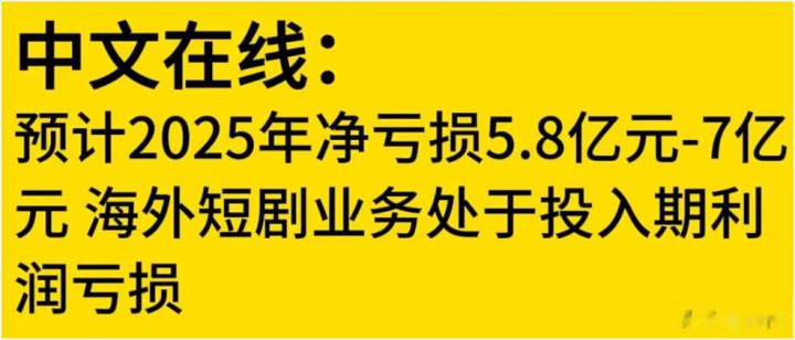 中文在线预计2025年净亏损5.8亿元-7亿元,其海外短剧业务处于投入期利润亏损,新兴业务的投入期往往需要时间来实现盈利,投资者需要关注该业务未来的发展潜力。
